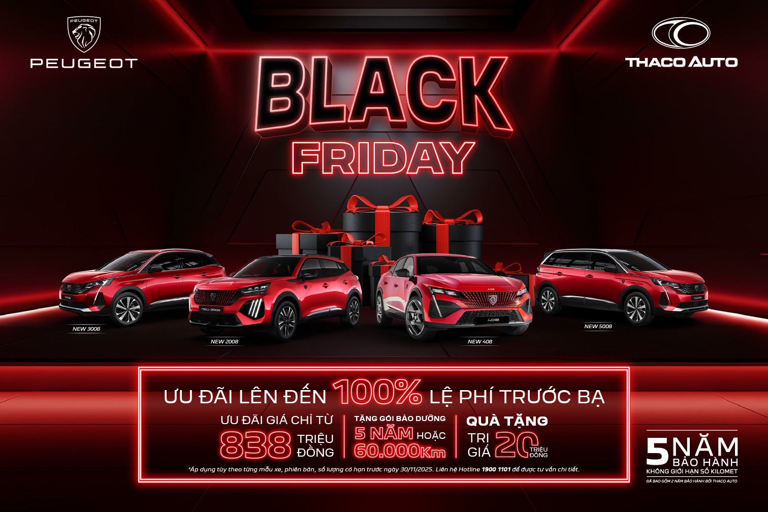 Chương trình ưu đãi áp dụng trên toàn bộ hệ thống đại lý Peugeot toàn quốc đến hết ngày 30/11/2025. Quý khách hàng vui lòng liên hệ Hotline 0933 806 156 hoặc đại lý gần nhất để được tư vấn chi tiết.